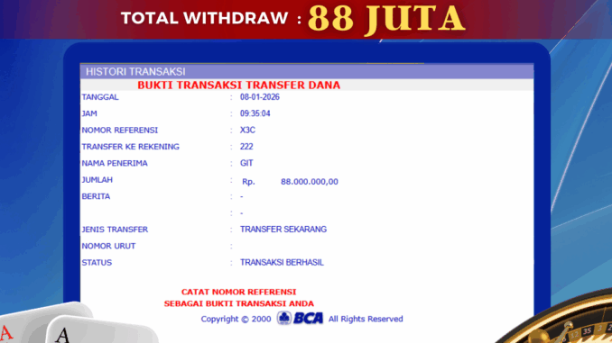 Bukti transfer yang dapat anda lihat adalah bukti SAH / VALID yang langsung di dapatkan melalui bukti transaksi dari Bank yang digunakan untuk pengiriman dana pada rekening pemilik user id. Terima kasih kami sampaikan kepada para pengguna setia BOLAGILA yang telah menggunakan situs kami, sebagai Bandar Terpercaya yang pastinya membayar semua kemenangan member hingga lunas. Apakah BOLAGILA PENIPU ? Reputasi “BOLAGILA TERPERCAYA” sudah sangat melekat.