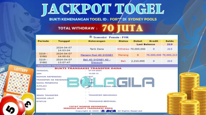 BOLAGILA JACKPOT TOGEL DI SYDNEY POOLS Rp 70.000.000,- LUNAS