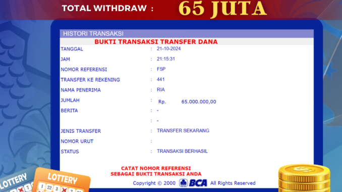 BOLAGILA mengucapkan selamat kepada user id : RIA*** yang telah berhasil mendapatkan jackpot TOGEL DI JOWOPOOLS. Kemenangan sebesar Rp 65.000.000,-. telah dibayarkan LUNAS oleh pihak bolagila kepada pemilik user id setelah yang bersangkutan mengisi formulir withdraw. Proses pencairan dana berlangsung sangat cepat hanya dalam waktu 6-11 menit Sudah berada dalam rekening pemilik user id.