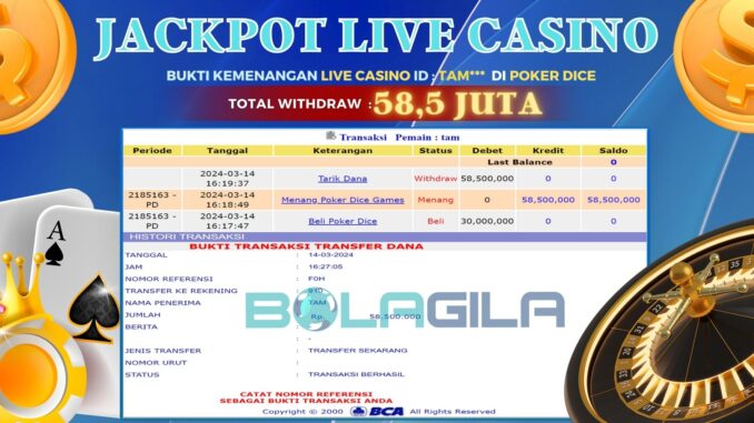 BOLAGILA JACKPOT LIVE CASINO POKER DICE Rp 58.500.000,- LUNAS