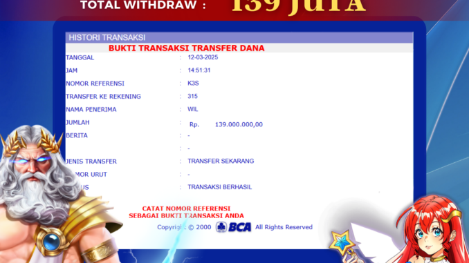SLOT DI MAHJONG WAYS. Kemenangan sebesar Rp 139.000.000,-. telah dibayarkan LUNAS oleh pihak bolagila kepada pemilik user id setelah yang bersangkutan mengisi formulir withdraw. Proses pencairan dana berlangsung sangat cepat hanya dalam waktu 6-11 menit Sudah berada dalam rekening pemilik user id.