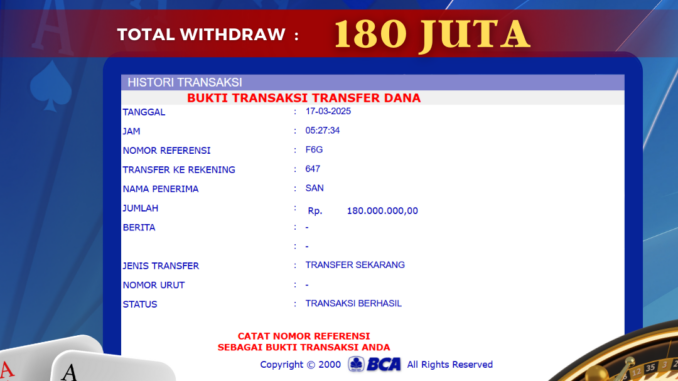 Bukti transfer yang dapat anda lihat adalah bukti SAH / VALID yang langsung di dapatkan melalui bukti transaksi dari Bank yang digunakan untuk pengiriman dana pada rekening pemilik user id. Terima kasih kami sampaikan kepada para pengguna setia BOLAGILA yang telah menggunakan situs kami, sebagai Bandar Terpercaya yang pastinya membayar semua kemenangan member hingga lunas. Apakah BOLAGILA PENIPU ? Reputasi “BOLAGILA TERPERCAYA” sudah sangat melekat.
