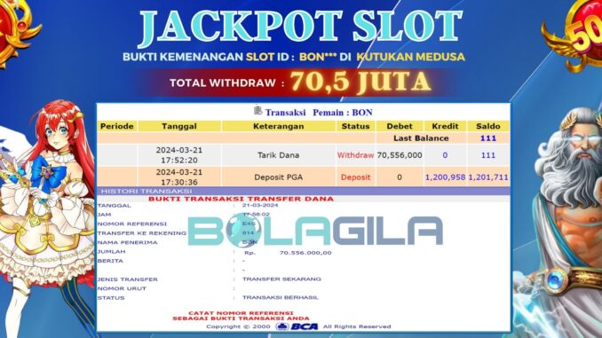 BOLAGILA JACKPOT SLOT DI KUTUKAN MEDUSA Rp 70.500.000,- LUNAS